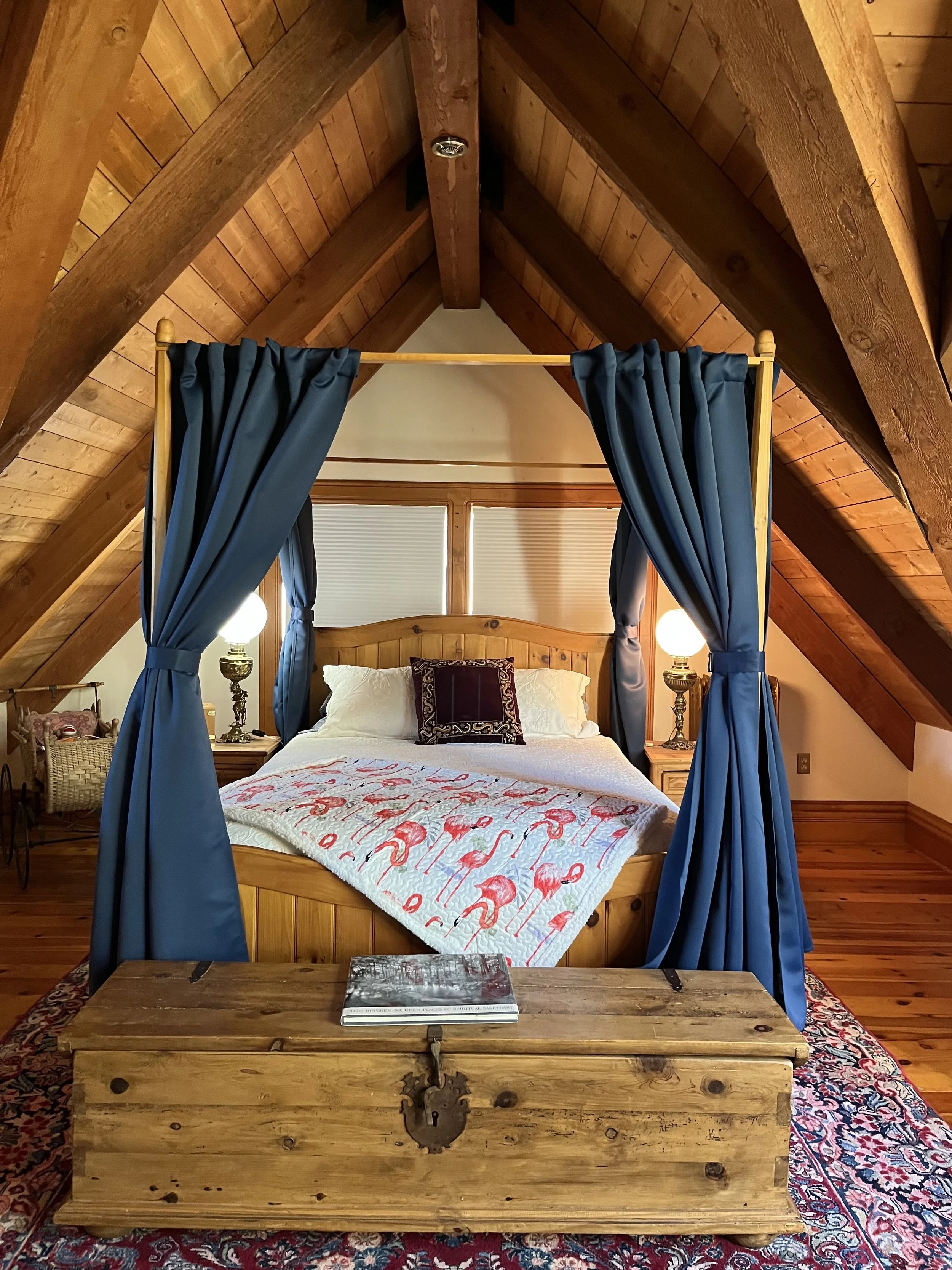 The coziest of the suites, Betty’s Room sits atop the third floor surrounded by impressive timbers and vaulted ceiling with superb lake views. A spacious room with a queen-sized four-poster bed, open-concept bathroom and sweet, covered balcony overlooking the lake are the highlights of this suite.